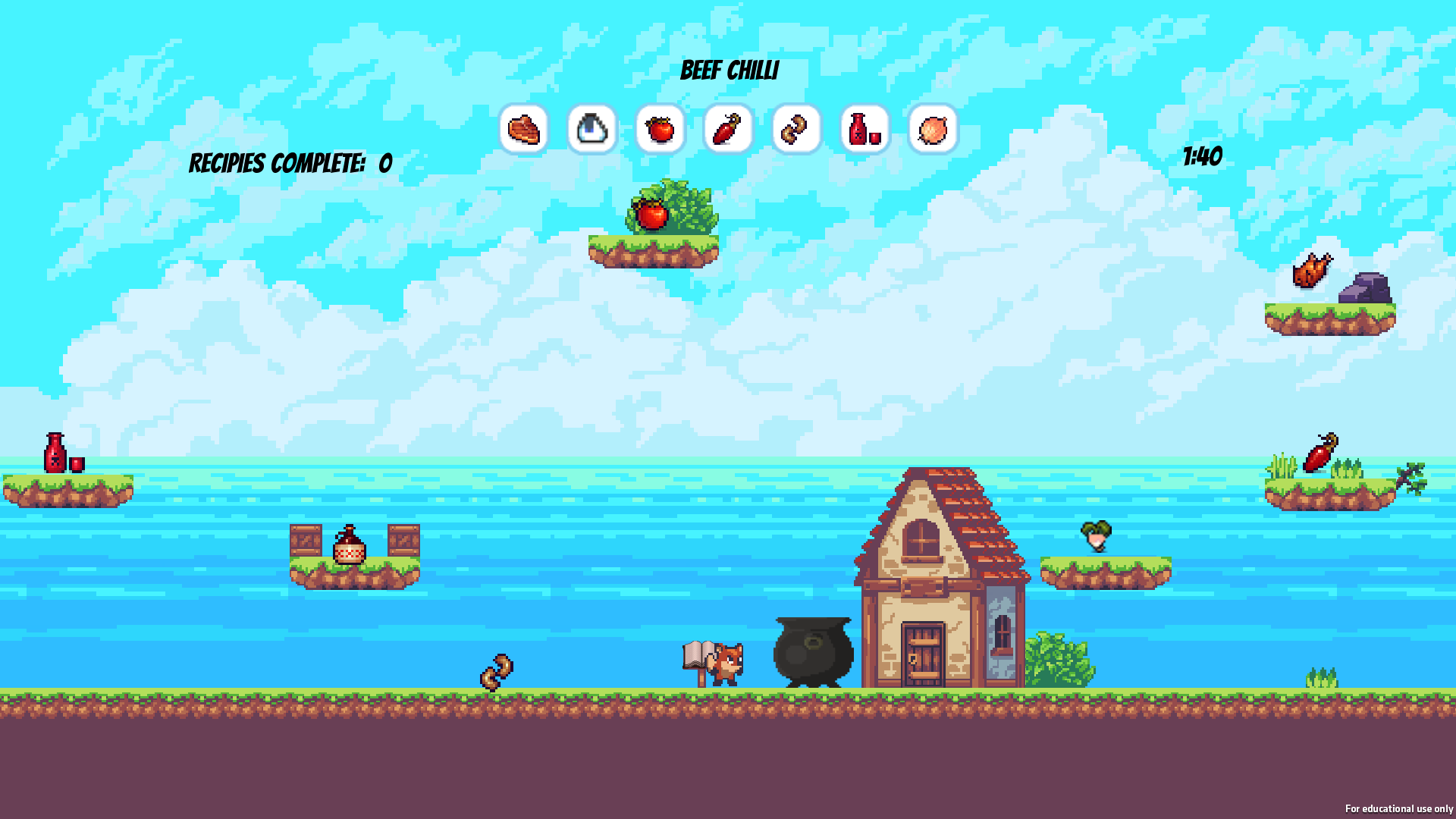 Cooking Run is a 2D platformer in which you must gather ingredients scattered across the map in order to create various different recipes.